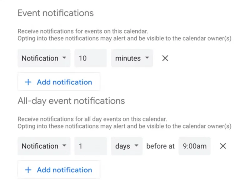 - Trong phần Event notifications, thêm thời gian thông báo theo ý muốn.