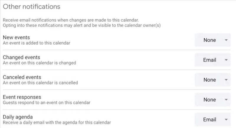 - Có thể bật email cho: Sự kiện mới, Sự kiện bị hủy, Nhắc nhở chương trình nghị sự hàng ngày,…