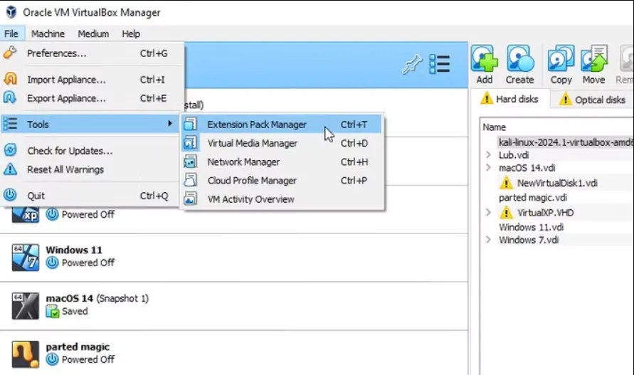 - Mở VirtualBox -> File -> Tools -> Extension Pack Manager để xác nhận đã bật