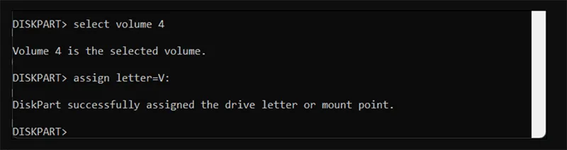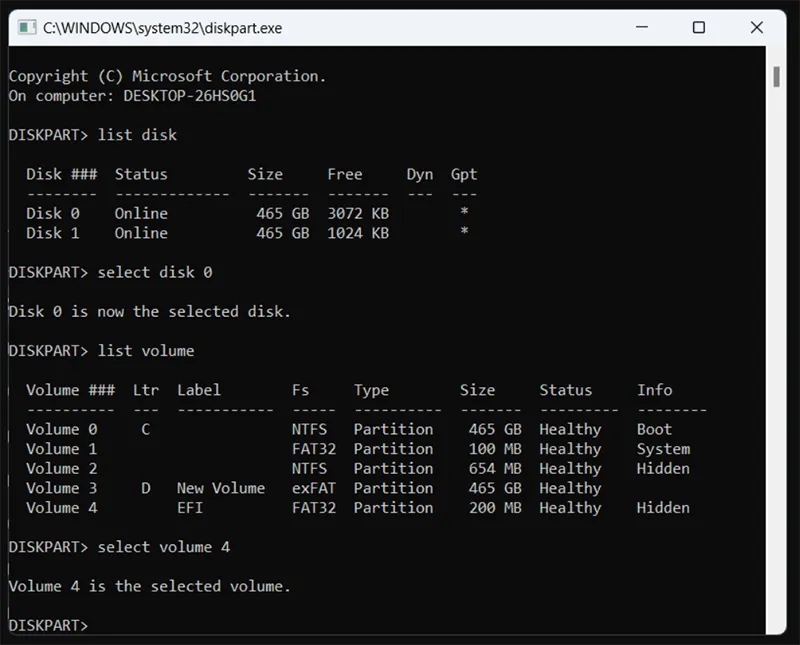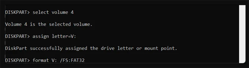 Định dạng lại phân vùng EFI: format V: /FS:FAT32