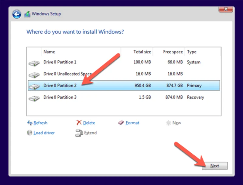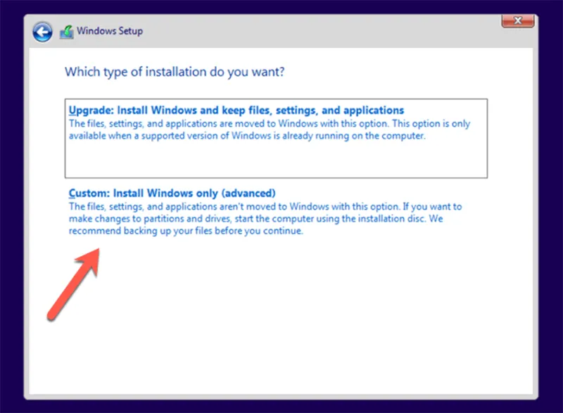 - Chọn “Custom Install” (Cài đặt tùy chỉnh). Không chọn Upgrade để tránh giữ lại cấu trúc boot lỗi cũ.
