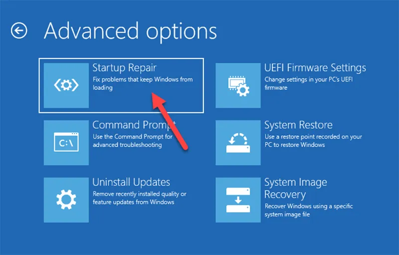 - Chọn: Troubleshoot -> Advanced options -> Startup Repair.