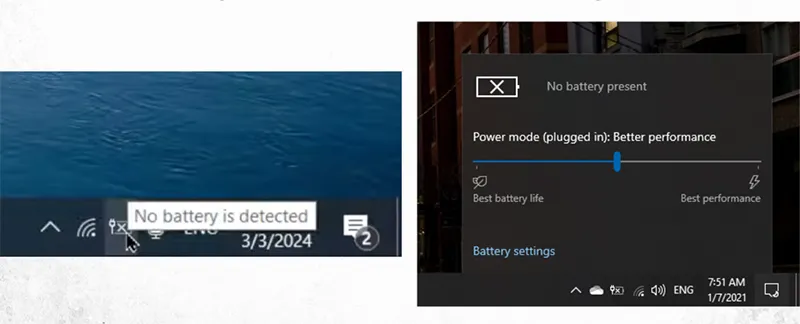 - Biểu tượng pin có dấu X trên thanh taskbar.