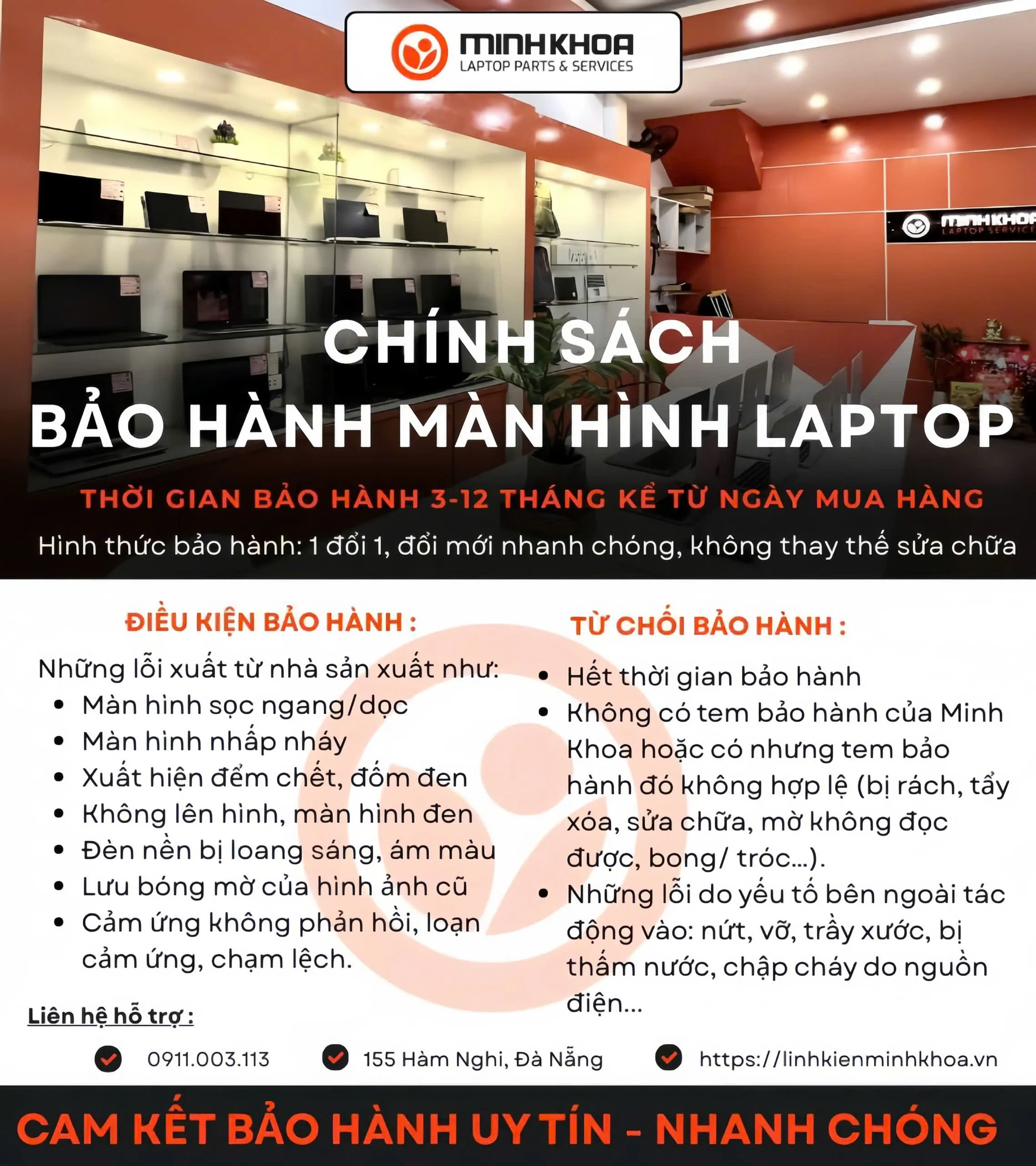Linh Kiện Minh Khoa chuyên cung cấp các linh kiện màn hình laptop chính hãng với đa dạng dòng sản phẩm, đáp ứng mọi nhu cầu từ khách lẻ đến đại lý sỉ trên toàn quốc. Với chính sách giá cạnh tranh, dịch vụ tư vấn tận tình và hỗ trợ vận chuyển nhanh chóng, chúng tôi cam kết mang đến sự hài lòng tối đa cho khách hàng. Liên hệ ngay để nhận báo giá tốt nhất!